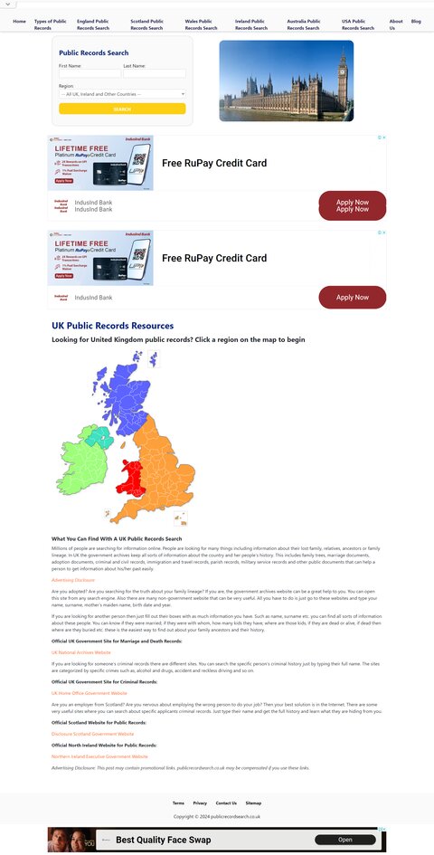 PublicRecordsSearch.co.uk is a one stop shop for all UK Public Records. You can search most any public record in the UK. These include genealogy records, criminal records, court records, death records, marriage records, divorce records, immigration records, parish records, military records and much more.